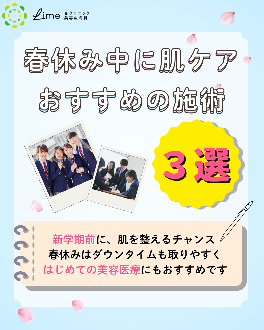 今回は、学生さんからのご相談が多いお悩みに合わせて、春休み中に受けやすいおすすめの施術を3つご紹介します。